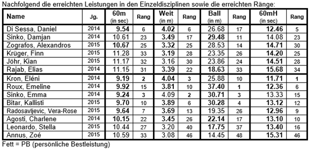 Bezogen auf die Disziplinen waren neben dem 60m Hürden-Sprint, in dem alle eine neue PB erzielten, vor allem der Weitsprung bei den meisten gut bis hervorragend gelungen. Pauline belegte mit 4.56m im Weitsprung den 4. Rang in dieser Disziplin.