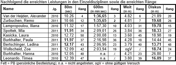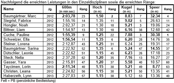 Vier neue PB erzielte Lorin Taycimen. Einige der Disziplinen absolvierte sie aber auch zum ersten Mal an einem Wettkampf. Über je zwei neue bzw. bestätigte PB im Hochsprung und Kugelstossen freuten sich Leonie Dütschler, Nelia Steck, Yara Gasser und Leana Christen. Lynn Haberzeth wies eine neue PB im Hochsprung aus.