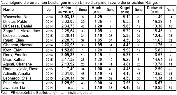 U14 (Jahrgänge 2012/2013) – Pauline Cuche mit Rang 2 in der 4-Kampf-Wertung, Sieg im Speerwurf und Rang 3 im Kugelstossen – Marc Baumgärtner mit Rang 4 in der 4-Kampf-Wertung und Rang 2 im Hochsprung – Noah Hongler mit Rang 3 im Kugelstossen