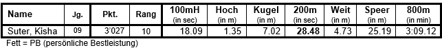 Für den LCR trat Kisha Suter zum 7-Kampf an. Sie zeigte einen soliden Mehrkampf und freute sich vor allem über ihre neue PB im 200m-Sprint und ihren guten 10. Rang!