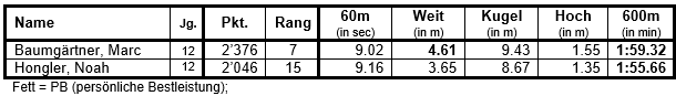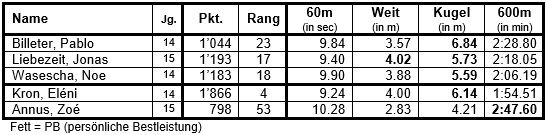 Bei den U14M traten 63 Athleten an. Marc Baumgärtner schloss den Wettkampf auf dem hervorragenden 7. Rang ab und freute sich beim gelungenen Saisonabschluss über seine neue PB im Weitsprung und im 600m, in dem er zum ersten Mal unter 2 Min. blieb! Sein Teamkollege Noah Hongler kam im 60m-Sprint nah an seine PB. Beim Weitsprung und Kugelstossen war diesmal der Wurm drin. Beim Hochsprung aber konnte er sich mit guten Sprüngen mental wieder auf Kurs bringen. Das gab ihm den Schub, um seine bisherige PB im 600m-Lauf um rd. 6 sec. zu unterbieten und mit 1:55.66 ebenfalls erstmals unter der 2-Min.-Marke zu bleiben!