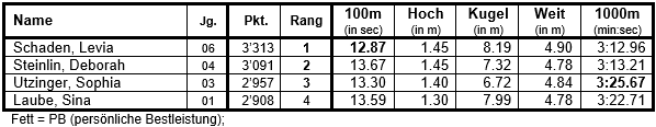 Bei den Mädchen waren insgesamt 66 Athletinnen am Start. Für den LCR traten Eléni Kron und Zoé Annus zum 4-Kampf an. Eléni erkämpfte sich mit sehr guten Leistungen nahe ihren PB einen hervorragenden 4. Rang! Zum Podest fehlten ihr nur 46 Pkt. auf die Drittplatzierte. Eine neue PB stellte sie im Kugelstossen auf. Zoé schaffte eine neue PB im 600m-Lauf.