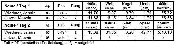 In der Königs-Disziplin traten Jannis Wiedmer (Männer) und Marwin Jetzer (U20M) zum 10-Kampf an. Beide starteten mit neuen Sprint-PB in den ersten Wettkampftag, den Jannis noch mit einer weiteren PB im 400m-Lauf beendete. Am 2. Tag trat Marwin leider nicht mehr an, da er noch durch eine Schulterprellung gehandicapt war. Dafür feuerte er aber seinen Teamkollegen Jannis weiter an. Zusammen mit Trainer Patrick Habegger trieben sie ihn zu weiteren Höchstleistungen an, so dass Jannis am Ende den 2 Platz belegte und mit der Silber-Medaille und fünf neuen PB nach Hause fuhr!