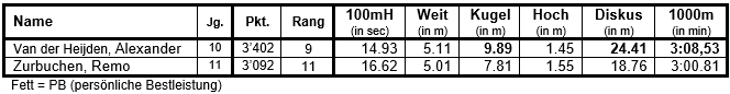 In der U16-Kategorie der Knaben massen sich Alexander Van der Heijden und sein Teamkollege Remo Zurbuchen mit weiteren 27 Athleten. Alexander belegte den tollen 9. Gesamtrang und freute sich über drei neue PB im Kugelstossen, Diskus und 1000m. Remo wurde insgesamt hervorragender 11. und verpasste eine neue PB im 1000m-Lauf nur ganz knapp, den er aber souverän als Bester aller Startenden beendete.