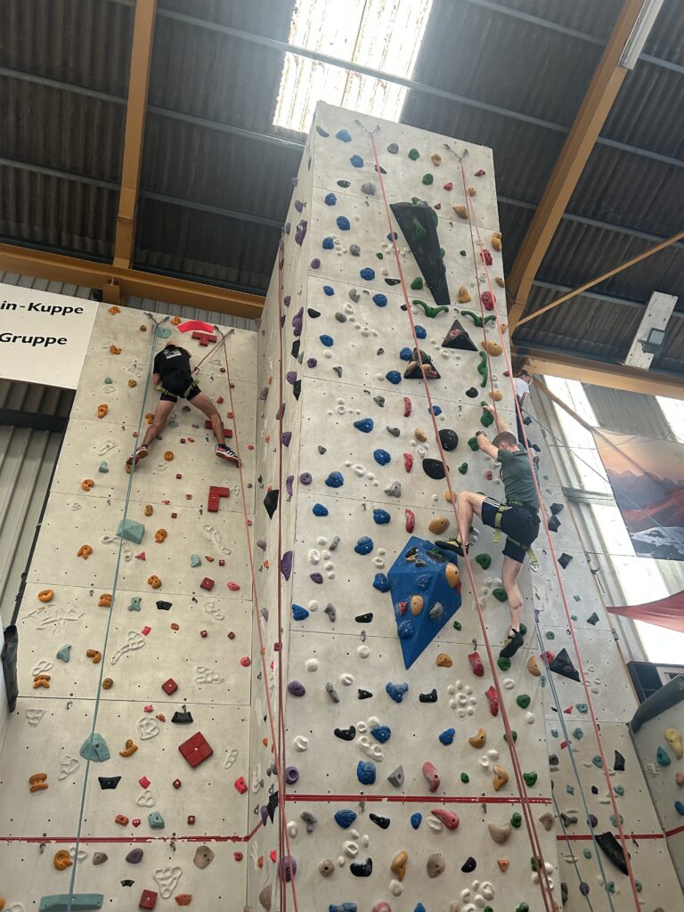 Am nächsten Tag hiess es für einige wiederum früh aufstehen. Mit einem ausgiebigen Frühstück starteten wir in den zweiten Tag. Heute stand Klettern auf dem Programm. Wir teilten uns in zwei Gruppen auf. Bevor es zur Kletterhalle ging, vergnügte sich die eine Gruppe noch mit Ligretto und Tabu in der Jugendherberge, während sich die andere dem Minigolf widmete. Die erste Gruppe machte sich dann vor dem Mittagessen auf den Weg in die Kletterhalle. Dort bekamen wir von einem Instruktor wichtige Einführungen zum Klettersport in der Halle. In Zweiergruppen konnten wir dann die Kletterwand erproben, und leichtere oder schwierigere Parcours absolvieren. Einige neu entdeckte Talente werden sich ab jetzt nicht nur in Laufschuhen behaupten, sondern vielleicht auch in Kletterfinken. Wir lassen uns überraschen!